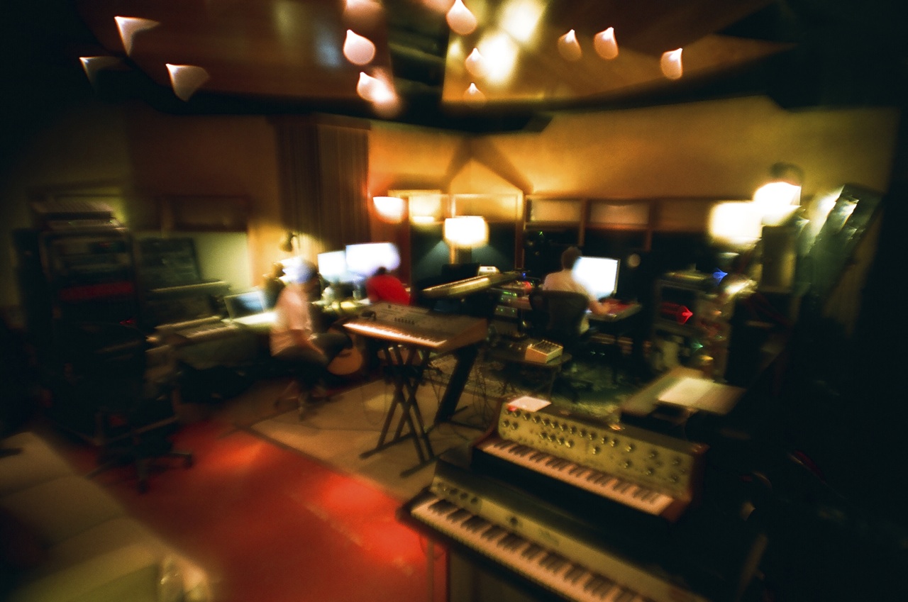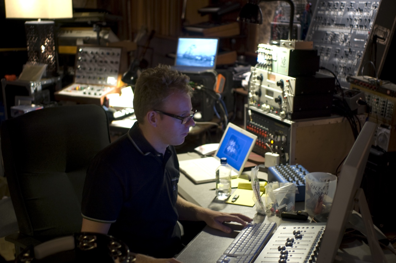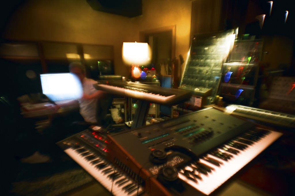 Fotó 1: Az előtérben egy Oberheim Matrix 12 ettől balra egy Roland Alpha-Juno 1 áll, felette Roland Jupiter-6. Tőle balra a producer Ben Hillier, és az a szép fehér folt pedig egy Mac monitor. A képen a többi kütyü még érdekesebb. Jobb oldalon két ősrégi ARP 2600 analog szinti, egy EMS VCS3 felette egy M-Audio MIDI billentyűzet.