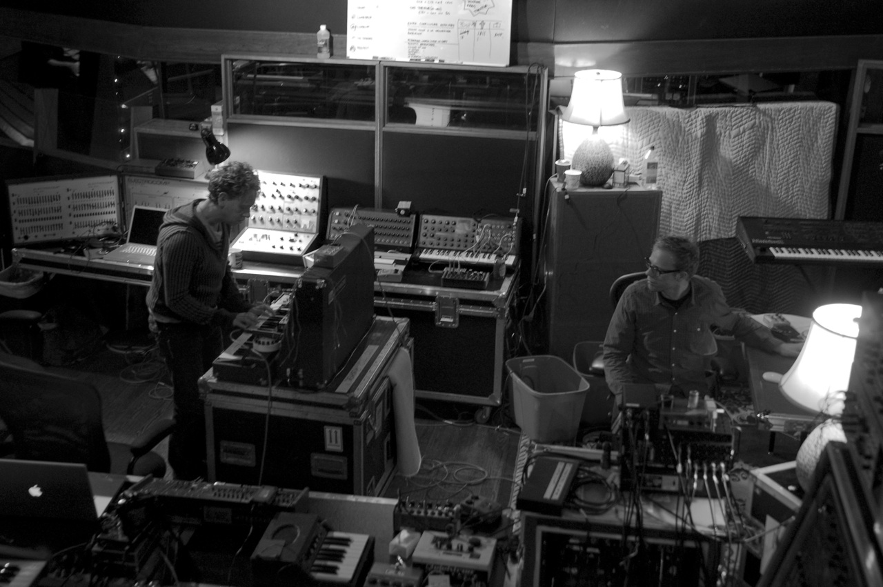 Fotó 3: Martin Gore épp egy ARP 2600-on játszik mialatt Ferg Peterkin hangmérnök kíséri figyelemmel. Martin mögött, balról jobbra: EML ElectroComp, MacBook Pro, EMS VCS3, Korg Analog Sequencer, Korg MS-20, asztali lámpa