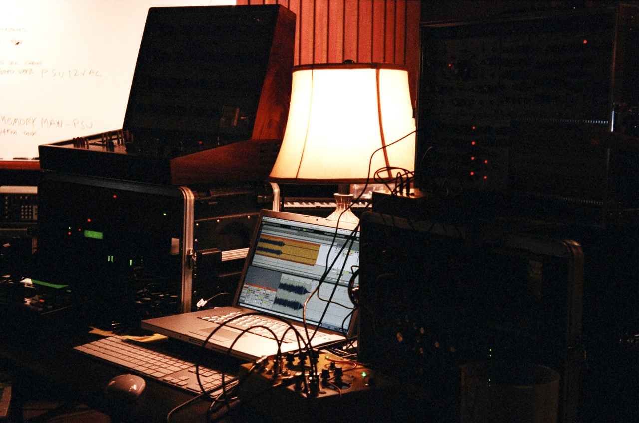 Fotó 4: A depeCHe MODE a stúdióban több helyet is felállított ahol Martin és Dave demóin dolgozhatnak. Ezeken a helyeken MacBook Pro-kat használnak. Itt az egyik MacBook Pro-n fut az Ableton Live, tőle balra egy EMS VCS3.