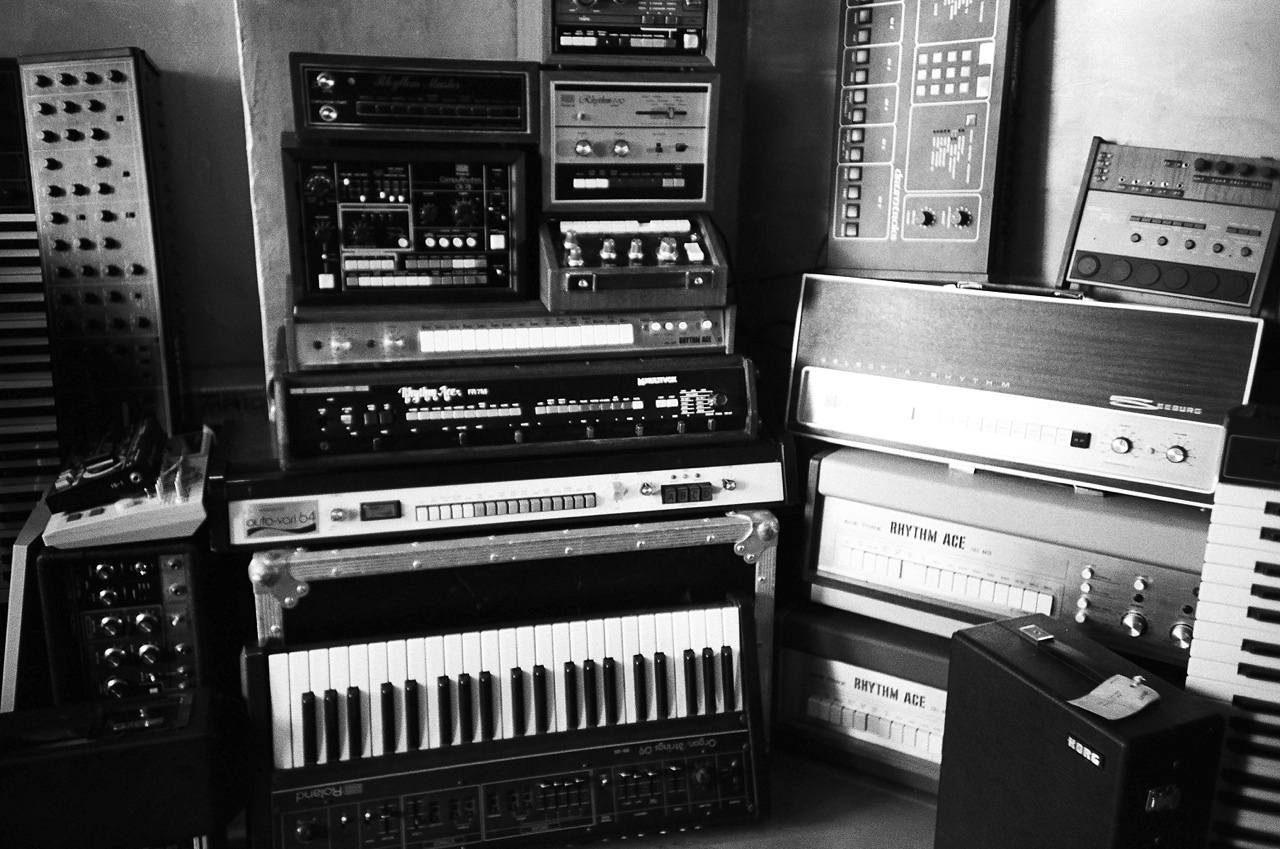 Fotó 2: Ez még ugyanaz a szoba, de egy másik kameraállásból, a középpontban egy Matrix 12. Az előtérben egy Rhodes Mk. Egy I Suitcase elektromos zongora, amin egy nagyon ritka Steiner-Parker Synthacon van.